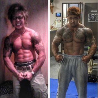 本格的なトレーニングを始めた頃と比較した画像です。トレーニングを始める前の安治川正人は体が細く、体重も55kg程度しかありませんでした。しかし、体を作るためにダーティバルクで食べることと過酷なトレーニングをすることで、約10年ほどで右画像のような体までになりました。