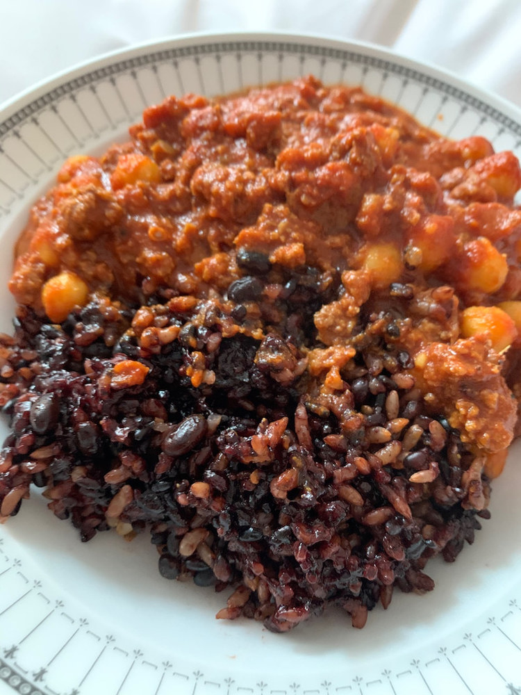 ①ひよこ豆、トマトピューレ、カレーパウダーを鍋に入れ火にかける