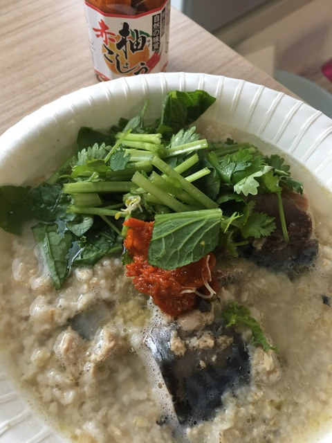 ①耐熱皿にオートミール・湯・鯖缶を入れて混ぜ合わせる