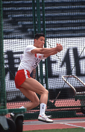 こちらはまだ室伏広治が高校生だった頃に、インターハイに出場したときに撮影された画像です。全体的にスリムですが、太ももや肩の筋肉がしっかりと鍛えられています。