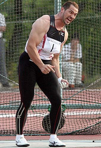 2008年に北京オリンピックに出場したときの室伏広治の筋肉が分かる画像です。これまでよりも上半身の筋肉がパンプアップしています。