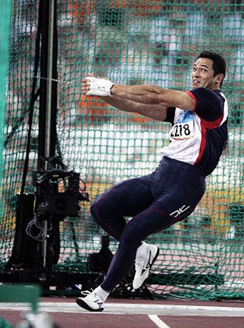 ハンマーを投げた後に雄叫びを上げる室伏広治の腕の筋肉がたくましく盛り上がっていてかっこいいです。