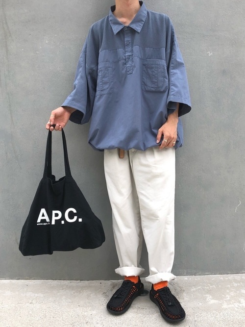 ハリのある素材のカバーオールが男らしいファッションに見せてくれます。優しい深みのあるベージュがおしゃれです。全体的にきれい目なメンズコーデなので、足元をKEEN(キーン)のユニークのサンダルにすることでコーデ全体が軽く抜け感が出ます。