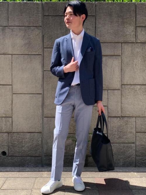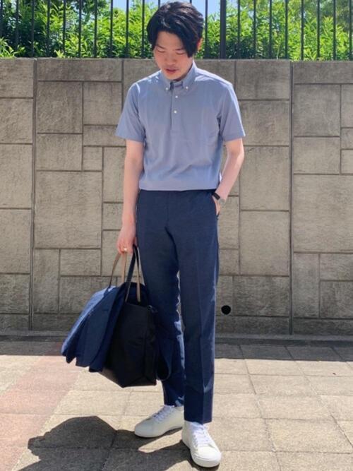 ブルー系でまとめられた爽やかなメンズコーデに、スニーカーを足して軽やかさを出したクールビズスタイルです。ブルー系でまとめることで夏らしい装いになり、白のスニーカーが馴染みやすくなっています。レザーのスニーカーをチョイスしているので、カジュアルになりすぎずほどよい雰囲気です。