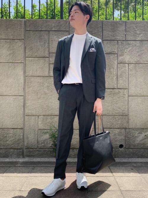 落ち着いたイメージが強いグレー系のセットアップとコーディネイトすることで、スニーカーのスポーティーさがほどよく馴染むクールビズスタイルになります。少しボリュームがあるスニーカーは、中間色であるグレーと合わせることが正解です。そうすることでいい意味で目立たず、きれいに決まります。