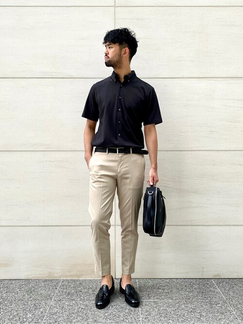 ベージュパンツと黒ポロシャツのメンズーデに、黒タッセルローファーを合わせたクールビズスタイルです。黒が多いですが、ポロシャツやローファーのカジュアルさが重い雰囲気を払拭しています。また淡いベージュで爽やかさをプラス。ベージュと黒の相性がいいことがとてもわかる着こなしです。