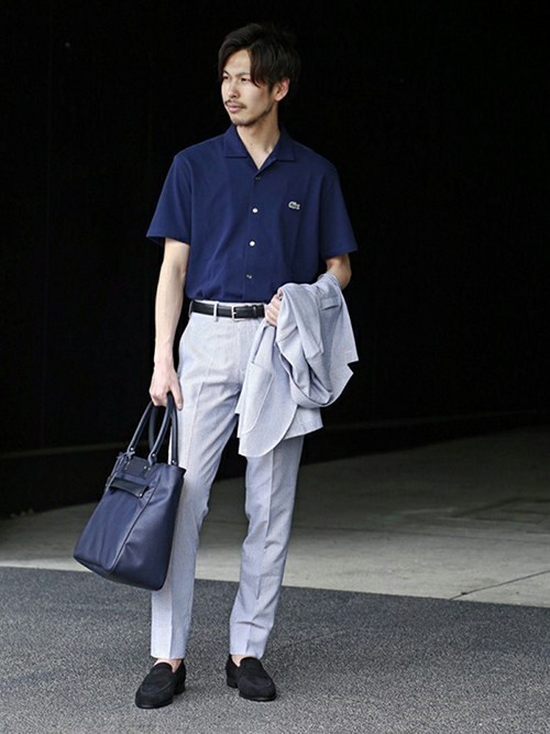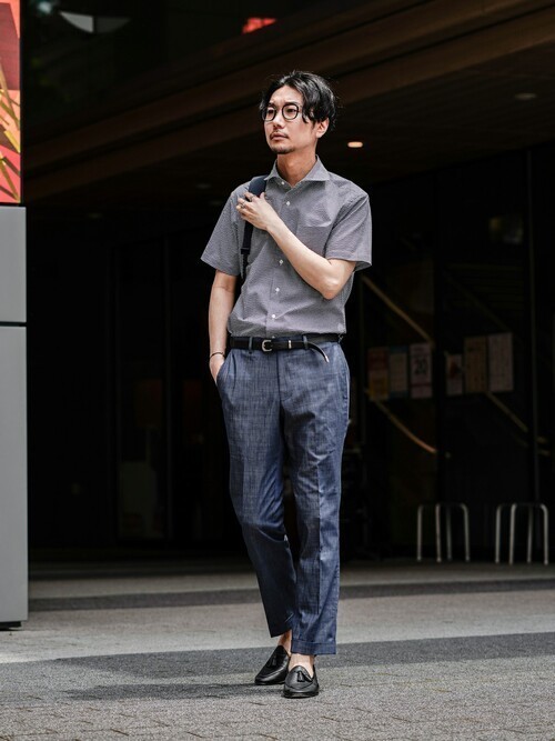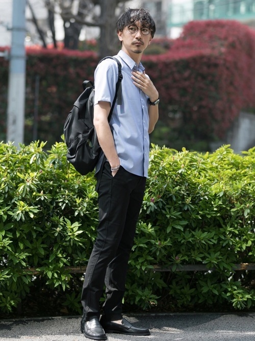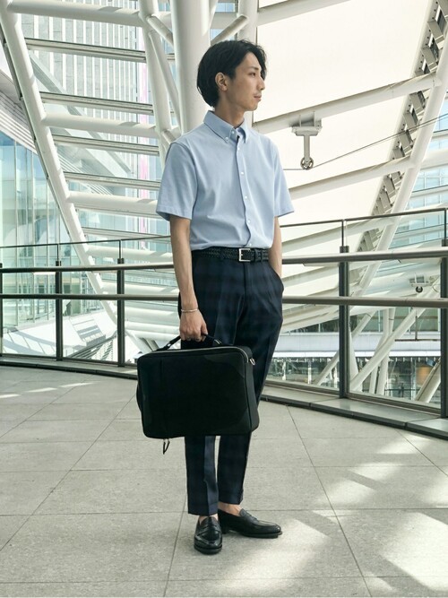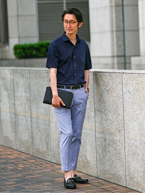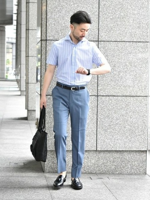 黒とブルーでまとめたクールビズコーデです。足元はローファーを合わせて軽さを出しています。またパンツも黒にしてきちっと感と統一感を確保していることがポイントです。シャツはブルー系のさわやかなものをチョイスして夏らしい着こなしにしています。大人きれいの着こなしとローファーの相性がとてもよく、真似しやすいメンズコーデです。
