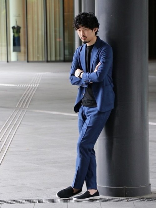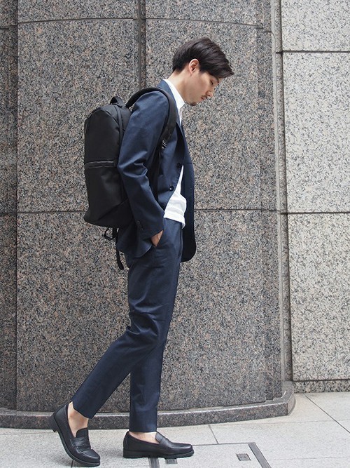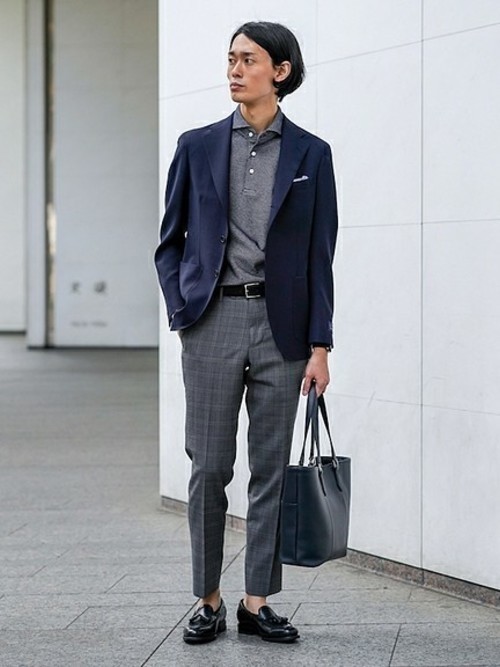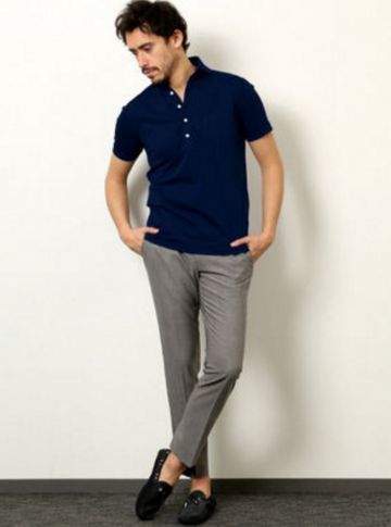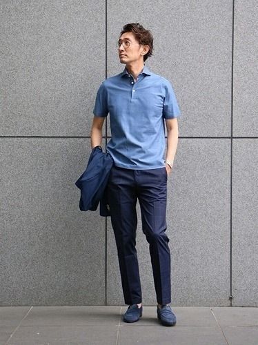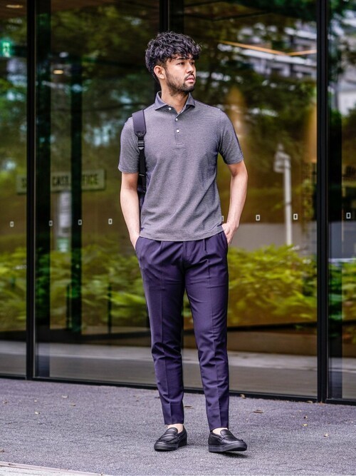 ネイビーのセットアップにポロシャツを着用して、足下には落ち着いた雰囲気のローファーを履いています。きちっと感があるネイビーのセットアップに合わせていて、崩しすぎず程よい抜け感がある着こなしです。またビジネスシーンでの定番カラーのみでコーディネイトすることで、カジュアルさが抑えられています。