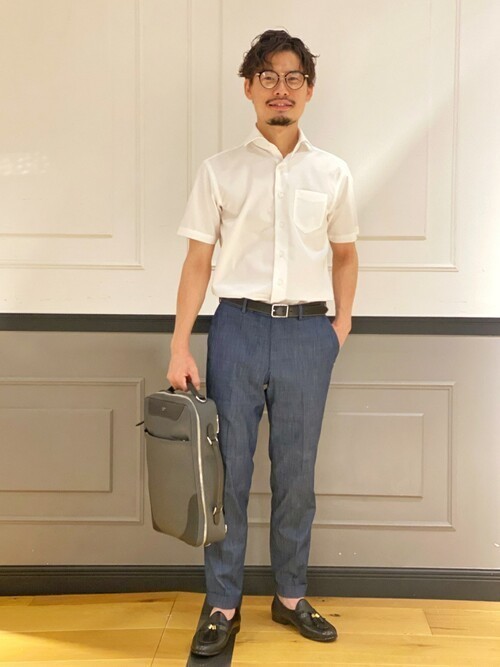 デニムライクパンツと白シャツのクリーンなメンズコーデに、タッセルローファーを合わせたクールビズスタイルです。デニムライクパンツとローファーの組み合わせの相性は抜群です。カジュアルですがともにきれいめの要素も持っているので、白シャツできちっと感を足しています。夏のビジネススタイルにカジュアルさがほしい方はぜひ真似してみてください。