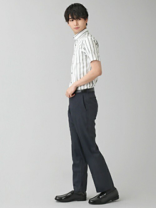 ネイビーパンツとストライプシャツのクールビズスタイルに、ローファーを合わせてきちっと感がある着こなしです。黒の靴下を合わせているので、カジュアルさが抑えられつつも、軽快さを残しています。上半身のストライプシャツに爽やかさがあるので、このように黒の靴下を組み合わせると、ローファーの表情が変わって着こなしの幅が広がります。
