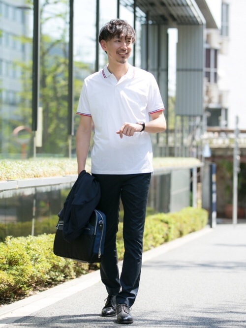 下半身が重い色合いてすが、チノパンと合わせることで若干のラフさがあります。またカジュアルな印象の外羽根式(紐穴の革が外向き)の革靴を選んでいるのもポイントです。上半身が白のポロシャツで軽快さとラフさがあるクールビズスタイルにしています。このような堅い印象のビジネスシューズの場合は、上半身に爽やかなトップスを持ってくることが大切です。