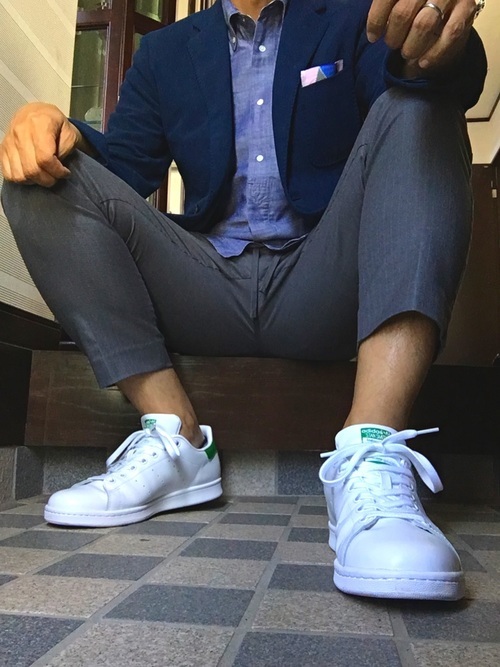 足元にスニーカーを取り入れると、軽快さがあるクールビズコーデに早変わりします。その他のアイテムを濃い色でまとめるときちっと感が出て、スニーカーが合わせやすいです。そしてブルー系だとさわやかさが出て馴染みがよくなります。