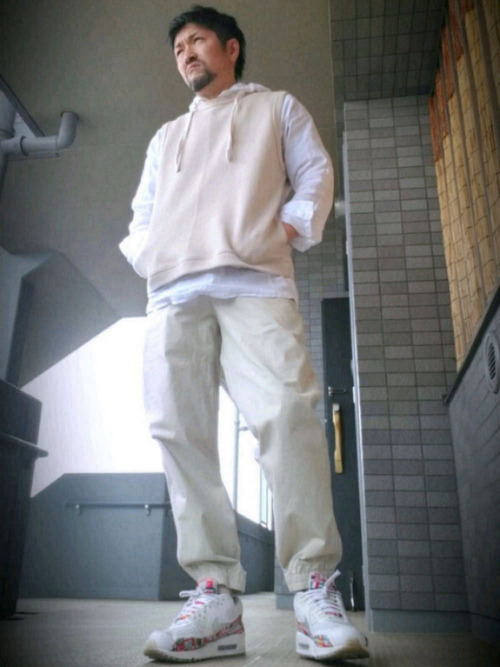 白とベージュを基調にした着こなし方が、見た目の清潔感をかもしだしている彼。アッパーに国旗パターンがあしらわれたエアマックス90が、いいアクセントになっていておしゃれに見えます。全身白一色でまとめた「ホワイトコーデ」も人気ですが、こちらは部分的にベージュを取り入れた上品な大人カジュアルコーデだと言えるでしょう。