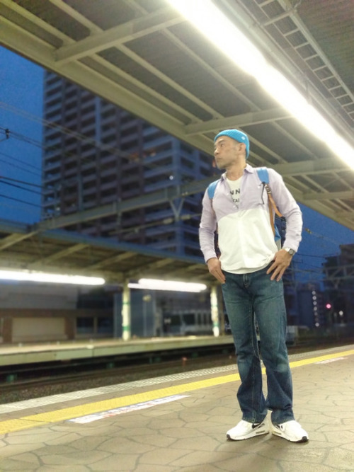 トップスのバイカラーシャツが、大人の雰囲気をかもしだしている彼。程よく履きこなした感じのあるジーンズに、白のエアマックス90が良く合ってます。同じ青でも、キャップとリュックを明るめの配色にしており、見た目に爽やかなのがポイント高いです。