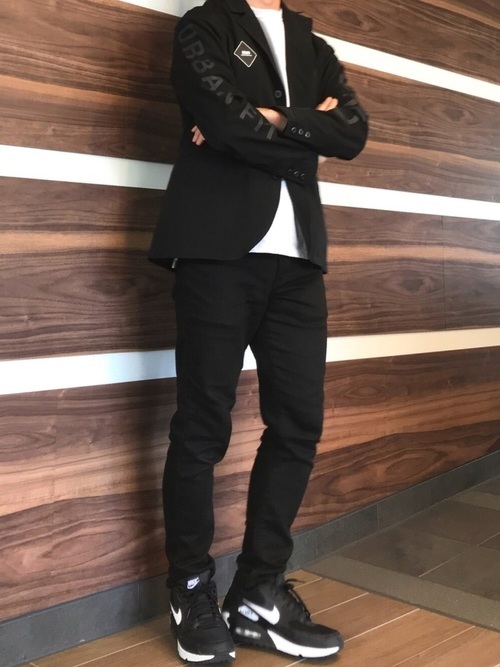 全身モノトーンな着こなしが大人の雰囲気をかもしだしていて、とてもおしゃれに見えます。黒のエアマックス90は、こういう着こなしに相性抜群なのが良く分かります。足元を赤のエアマックス90に変えたりインナーを赤Tに変えたりして、遊び心をもたせるのも良いかもしれません。