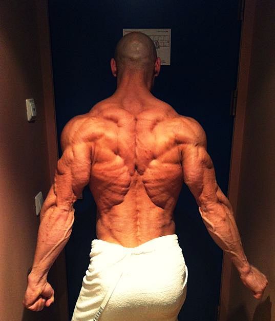 筋肉の大きさで競うなら、ドリアン・イェーツは外せないでしょう。僧帽筋が上へ、大円筋が外へと伸びているようです。