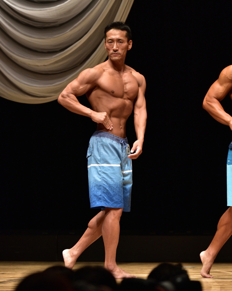 一番左にいる方が本人です。彼は45歳にして初めてフィジークに挑戦し見事優勝を勝ち取りました。筋トレ歴は15年でフィジークに挑戦するようになってからは2年という歴の持ち主です。自分の実力はどのくらいなのだろうかと参加したところ、見事優勝を果たしました。