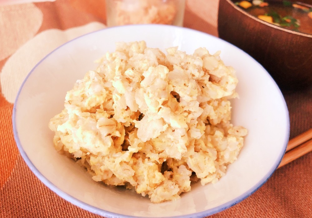 オートミールを加熱して主食とするレシピです。オートミールはオーツ麦という穀物からできた食材で、グラノーラの材料としても使われています。油を使わずに作られるためカロリーが低いことが特徴です。オートミールは白米の20倍もの食物繊維を含んでいます。また、血糖値の上昇が穏やかで、痩せやすい体を作ることができる食品です。