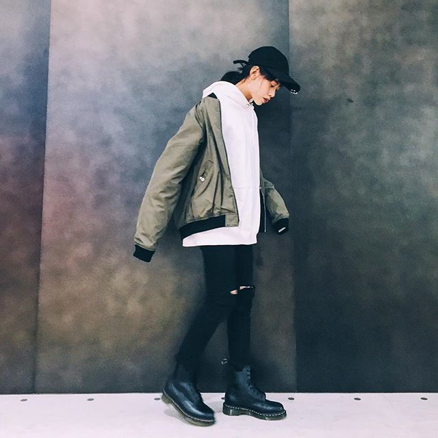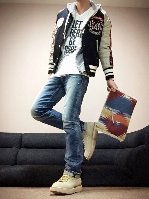 黒のスタジャンとジーンズを着こなした、ストリート系ファッションです。ブーツには淡いベージュを合わせているので、足元で適度な抜け感を演出できています。