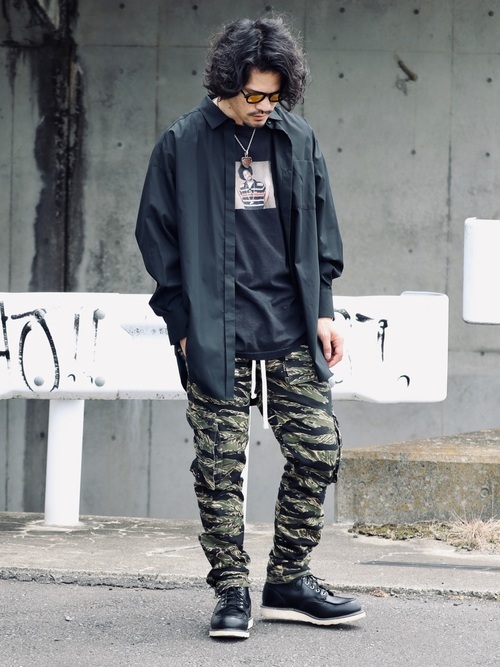 迷彩柄のカーゴパンツを合わせた、ワイルドな雰囲気のメンズコーデです。パンツのほかにはシャツとブーツに黒を選んでおり、シックな雰囲気にまとめているのも特徴となっています。