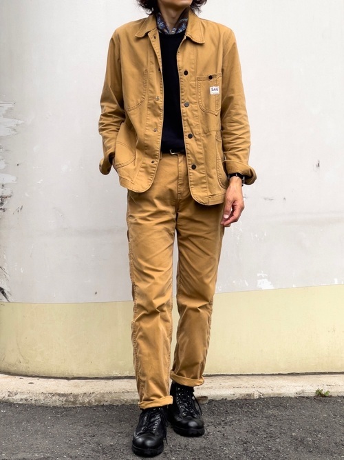ブラウンカラーのセットアップで合わせた、カジュアルスタイルのメンズファッションです。ワークブーツはジーンズなどとも相性がよいですが、こちらのコーデのようにすっきりとした着こなしにもよく合います。靴には黒のブーツを選び、足元を引き締めています。