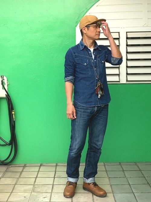 上下をデニム地のアイテムで合わせた、休日感のある雰囲気のファッションです。帽子と足元にブラウンのアイテムを持ってきており、デニム地のアイテムとうまくマッチしています。