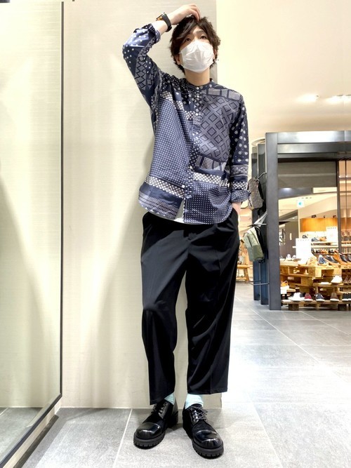ブルーの柄シャツに、黒のパンツ、ブーツを合わせた着こなしです。ワイドパンツとボリュームのあるブーツを合わせており、足元が寂しすぎない印象に仕上がっています。全体的にバランスの取れた、スタイリッシュな着こなしでもあります。