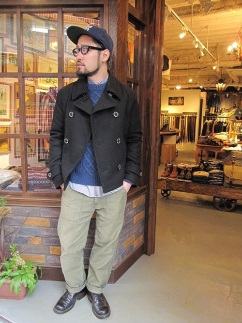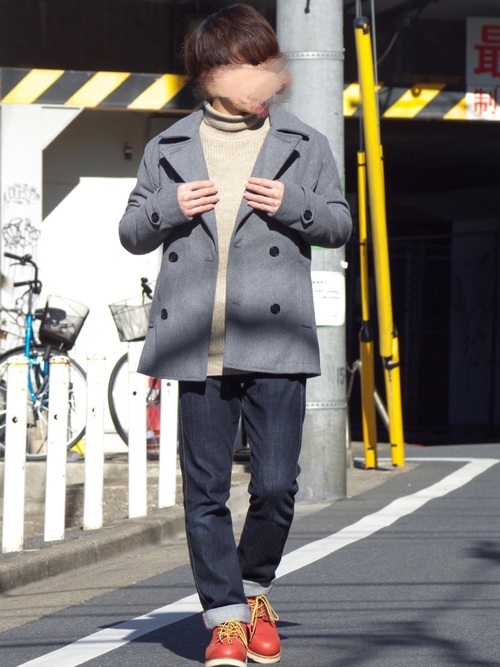 グレーのピーコートとタートルネックを着こなした、落ち着いたカラーのアイテムを上手に組み合わせた着こなしです。足元に明るいブラウンのブーツを持ってきており、全体のカラーバランスが上手にまとめられています。