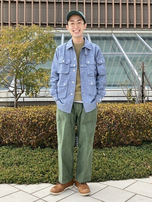 ベージュのチノパンを履きこなした、ゆったりとしたアイテムでコーディネートしたゆるコーデです。ワークブーツにはブルーのアイテムを選んでおり、足元の上手なアクセントとして活きています。
