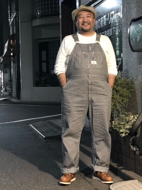 黄色×黒のネルシャツと、デニム地のオーバーオールをバランスよく組み合わせたメンズファッションです。ニットキャップとブーツにはブラウン系のアイテムを合わせており、少年らしさを感じる着こなしでもあります。