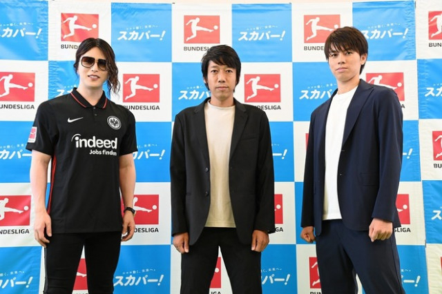 画像右はじの田中碧は、カジュアルなネイビーカラーのジャケットがよく似合っています。シンプルな着こなしですが、鍛えた体にフィットしています。大人のさわやかなおしゃれがぴったりです。