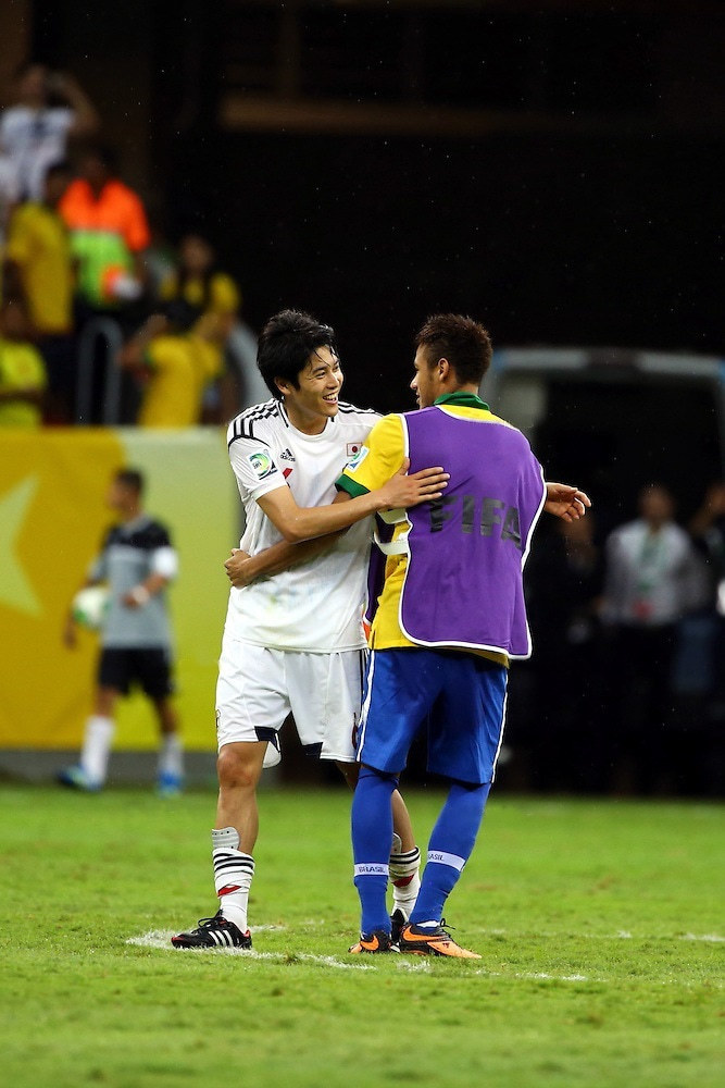 2013年コンフェデレーションズカップの日本VSブラジルの1戦で、ネイマールが内田篤人の、マッチアップ相手としてのプレイを讃えてハグしています。ここでも同じくらいの身長に見えます。ちなみに、隣にいるのは元日本代表の乾貴士で、身長169cm、体重63kgです。3人ともあまり変わらない身長にみえます。