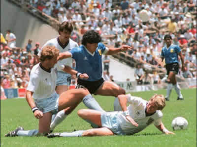 同じドリブルテクニックが強みであっても、マラドーナは更に腕を大きく振り回し、スピードと体の強さにて野性的な攻撃をしていきました。その代表的な試合が、ハーフウェーラインから約60メートルを単独で5人を抜き、シュートを決めた伝説の5人抜きドリブルです。この試合を見た誰もが、彼のプレーに大興奮しました。