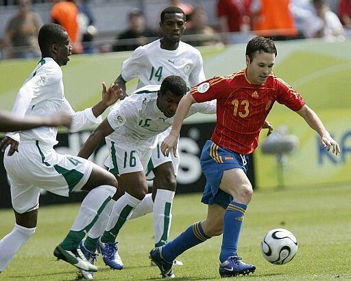 出典:https://www.pinterest.jp/pin/132363676527204255/2006年ワールドカップ、サウジアラビア戦でのイニエスタです。的確にボールを追いかけて活躍しました。
