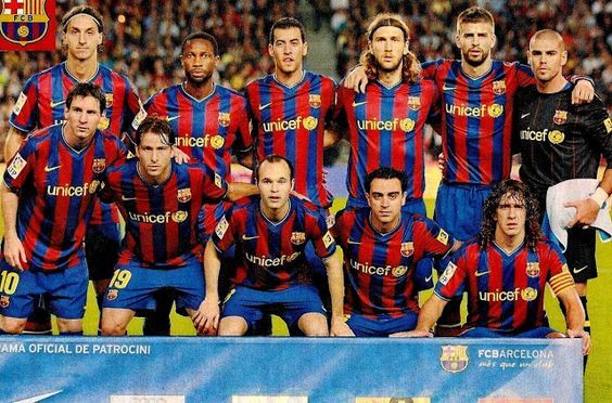 出典:https://www.pinterest.jp/pin/478929741621149794/2009年のバルセロナチームの画像です。中央手前に構えるイニエスタは、このとき25歳でメッシやビシャなど有名選手が並んでいます。