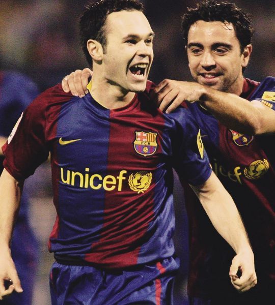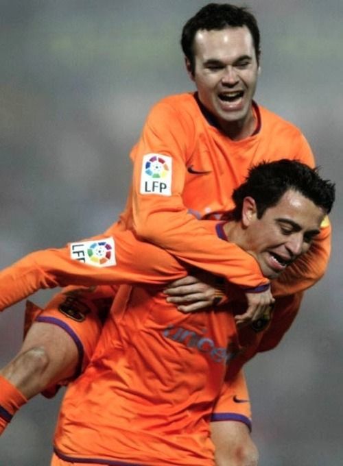 出典:https://www.pinterest.jp/pin/701576448200615303/若い頃のイニエスタの素敵な笑顔の画像です。シャビが背後から肩に手を乗せてる姿も、どこか微笑ましいシーンとなっています。