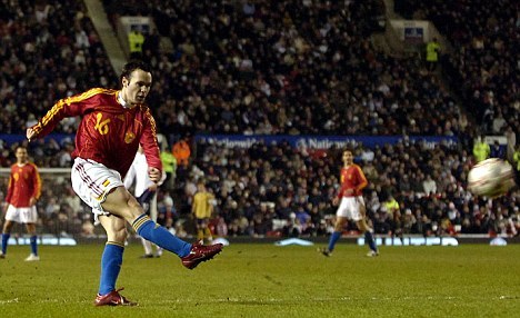 出典:https://www.dailymail.co.uk/sport/football/article-2058701/England-v-Spain-The-making-Spanish-gold.html2006年、イニエスタはスペイン代表の初レギュラーポジションを獲得しました。スペインA代表に選ばれ、グループリーグ突破後の3戦目にイニエスタは出場しています。翌年2007年2月のイングランド戦では、スペイン代表初ゴールを決め、見事なミドルシュートで驚かせました。