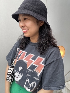 パーマをかけたボブスタイルはカジュアルなファッションにぴったりです。