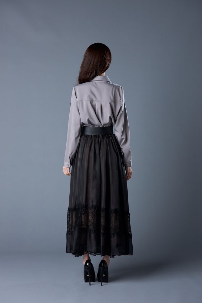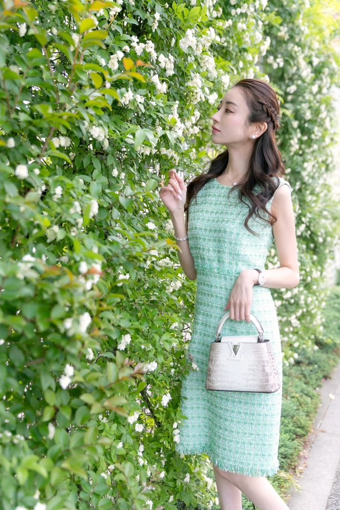2020年4月の『エミリアウィズ』新作を着用している愛沢えみり。このときの髪型は、ロングヘアをサイド三つ編みにヘアアレンジしています。
