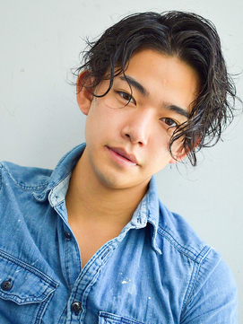 前髪を長く残したマッシュスタイルは、ロングなのに軽い仕上がりになりイメージもよいのが魅力です。またウェット感をだした無造作なパーマは、男の色気がでるので女性からも好印象なヘアスタイルとなります。