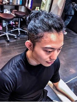 サイドは好きな位置でツーブロックに刈り上げ、長く伸ばした前髪トップはウェーブがしっかりでるよう、細めのロッドでパーマをあててもらいましょう。マンバンにしたときにパーマの束感がしっかりみえるよう、ツーブロックはあまり高めにしないのがおすすめですよ。