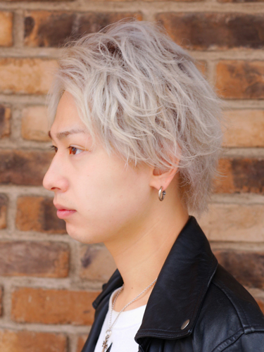 ウルフマッシュショートベースで、襟足はやや長め、分け目をつけてカットしてもらいましょう。カラーはスノーホワイティカラーでオーダー。パーマはスパイラルパーマをランダムにオーダーします。