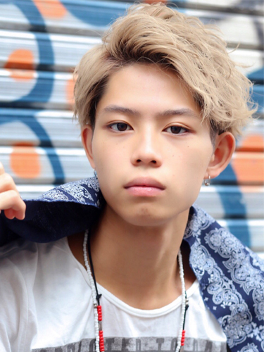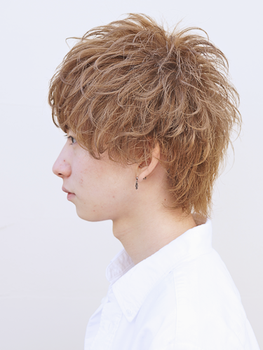 マッシュベースでサイドと襟足はツーブロック。毛先全体に動きが出るようにカットしてもらいましょう。カラーは、あえて根元を染めないで、ブリーチ後にイノセントベージュでオーダーします。パーマはスパイラルパーマをランダムに、強めでオーダーします。