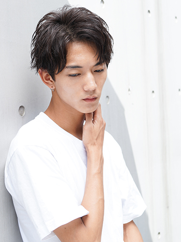 サイドと後ろはすっきりと短めにカットしツーブロックにしましょう。前髪は目が隠れるくらいの長さに、トップも長めに残してください。長く残した前髪とトップには大き目のロッドでゆるいパーマをあてましょう。