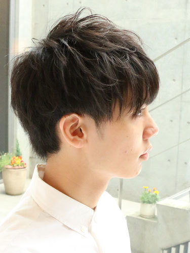 サイドパートのアップバングで耳周りと襟足は短めに、トップは長めに残してカットしてもらいましょう。カラーは黒髪のまま、パーマはミックスパーマで流れる前髪を作ります。