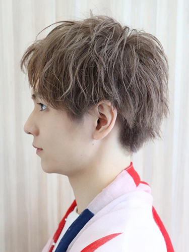 サイドから襟足はツーブロックで、全体は重めのマッシュベースで、無造作感が出るようにランダムに軽さを入れてカットしてもらいましょう。カラーはスノーアッシュ。パーマはスパイラルパーマをゆるめでオーダーします。