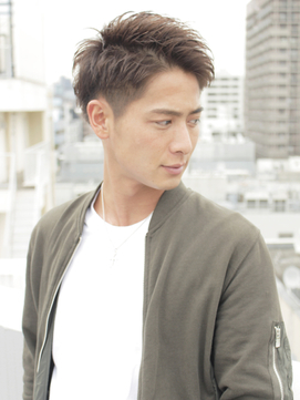 全体的に短めにしたマッシュベースのツーブロックスタイルです。前髪を上げたアップバングにすることで、顔全体が明るくなって爽やかさが増します。ビジネススーツにも、カジュアルなファッションにも合う万能アップバングスタイルです。