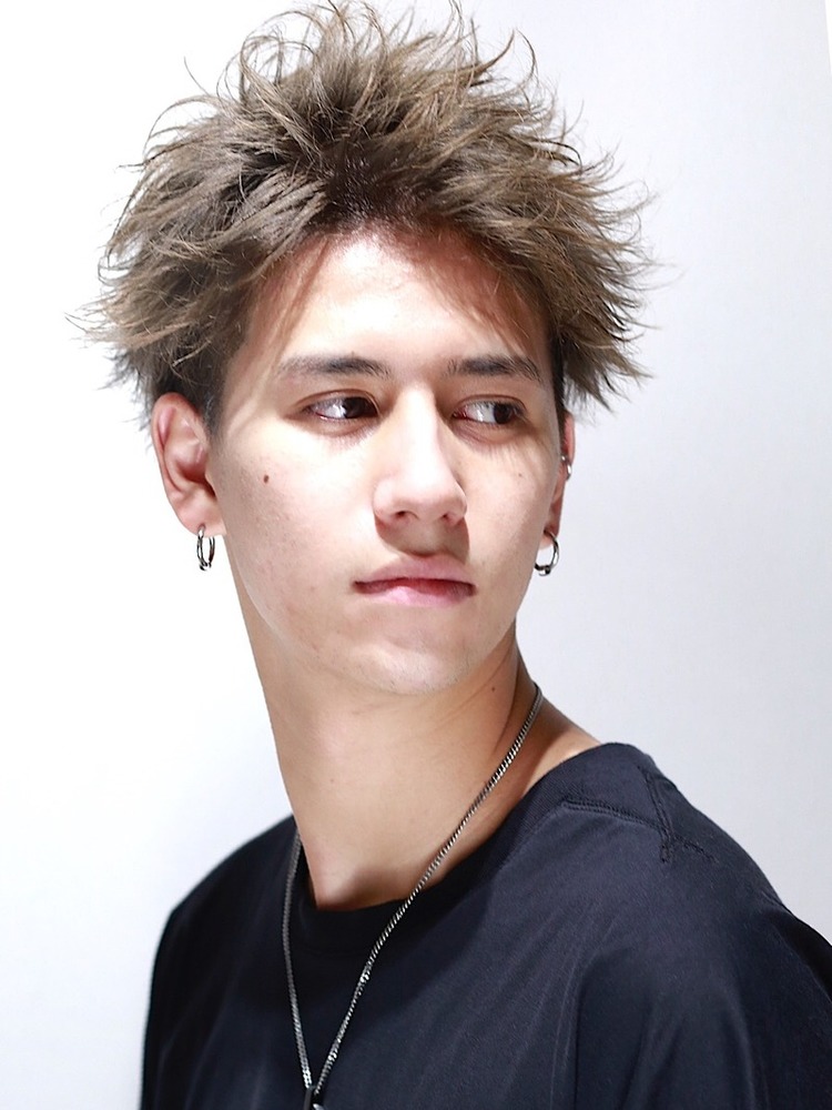 一見可愛い系に転びがちなメンズのマッシュウルフも、スパイラルパーマと外ハネのスタイリングで色気のある雰囲気に。スパイラルパーマをあてた毛先を細かく散らしてハネさせることで、毛先に柔らかな質感を出したヘアスタイルです。