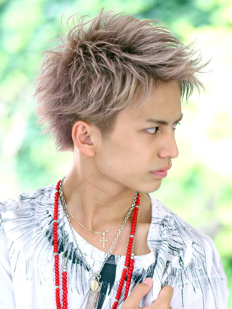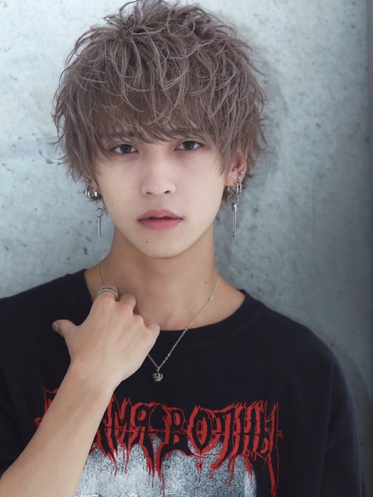 ショートのソフトウルフがナチュラルな印象を与えつつ、個性的なハイトーンカラーと無造作パーマがエッジを効かせたメンズヘアスタイルです。トップから前髪へ向かって散らすように耳周りと後ろは細かくハネさせることで、作りすぎない無造作な印象を与えます。透明感のあるアメジストベージュが、自然で立体的な毛流れを演出してくれます。