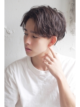 マッシュベースのウルフカットです。サイドと前髪は長めに目にかかるくらい残しておくと、センターパートでのスタイリングが簡単です。毛先にパーマをかけて寝癖風のナチュラルなスタイルになっています。